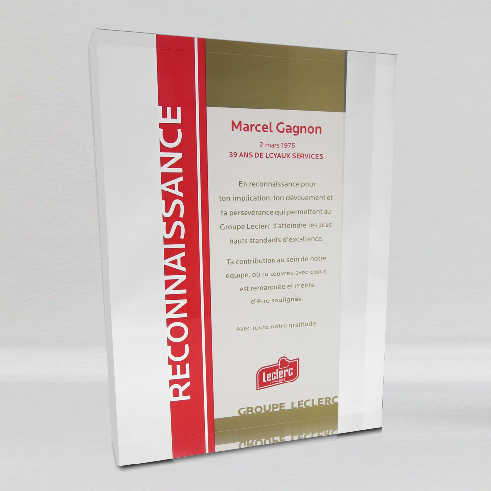 Marque de reconnaissance des employés de Biscuits Leclerc. Bloc d’acrylique autoportant sérigraphié.