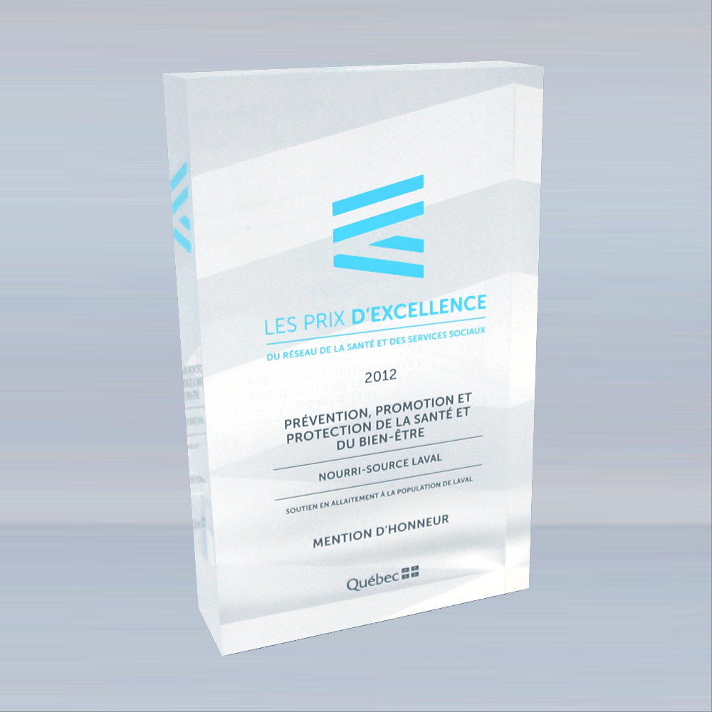 Bloc d’acrylique 1,5 po personnalisé par sérigraphie, dans un cadre en aluminium peint. Prix d’excellence réalisé pour le Ministère de la santé et des services sociaux du Québec.