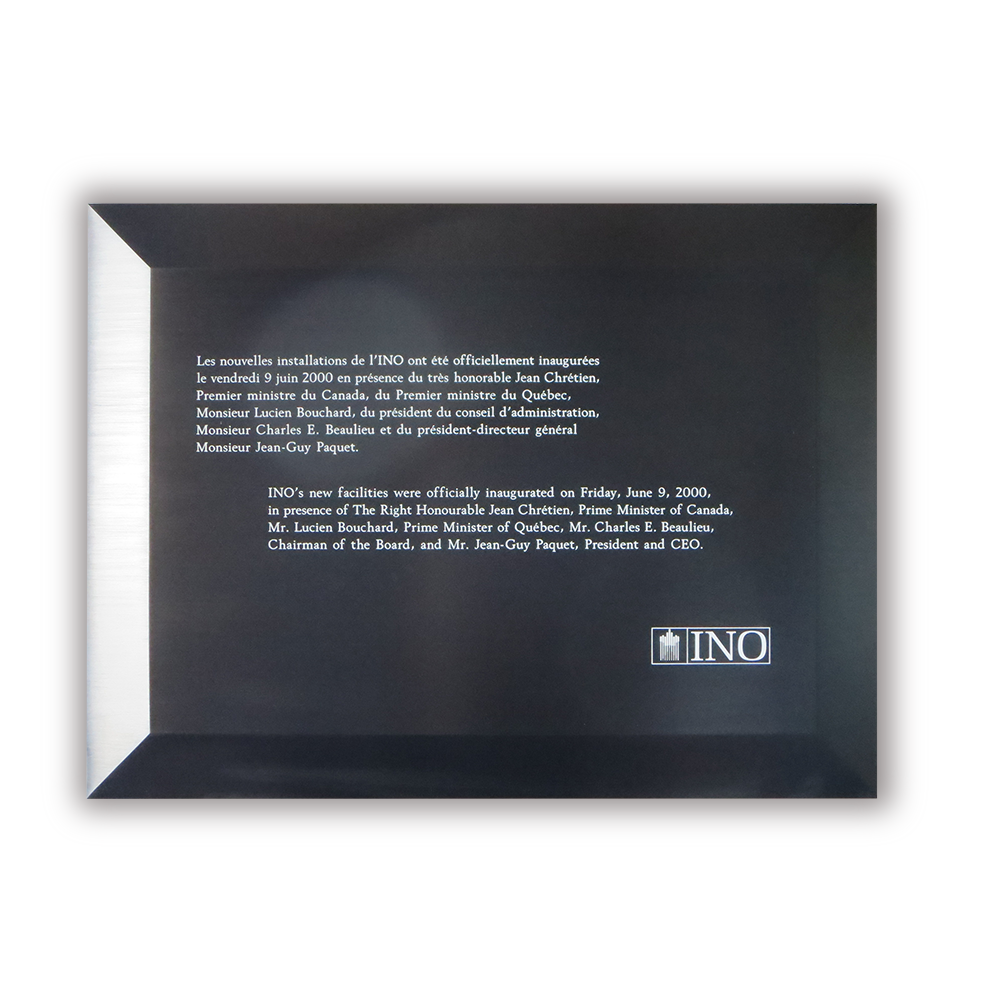 Plaque d’identification en granit gravé noir poli biseauté peinture blanche dans la gravure. Le granit est un matériau noble qui résiste bien aux intempéries.