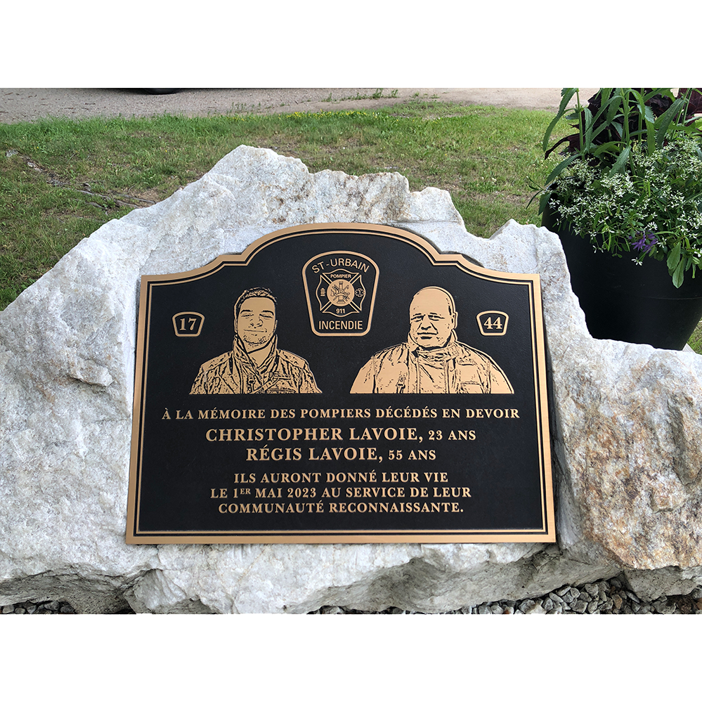 Mémorial pour les pompiers de Saint-Urbain morts en devoir en 2023. Plaque de bronze coulé sur un socle de pierre naturelle de la région.