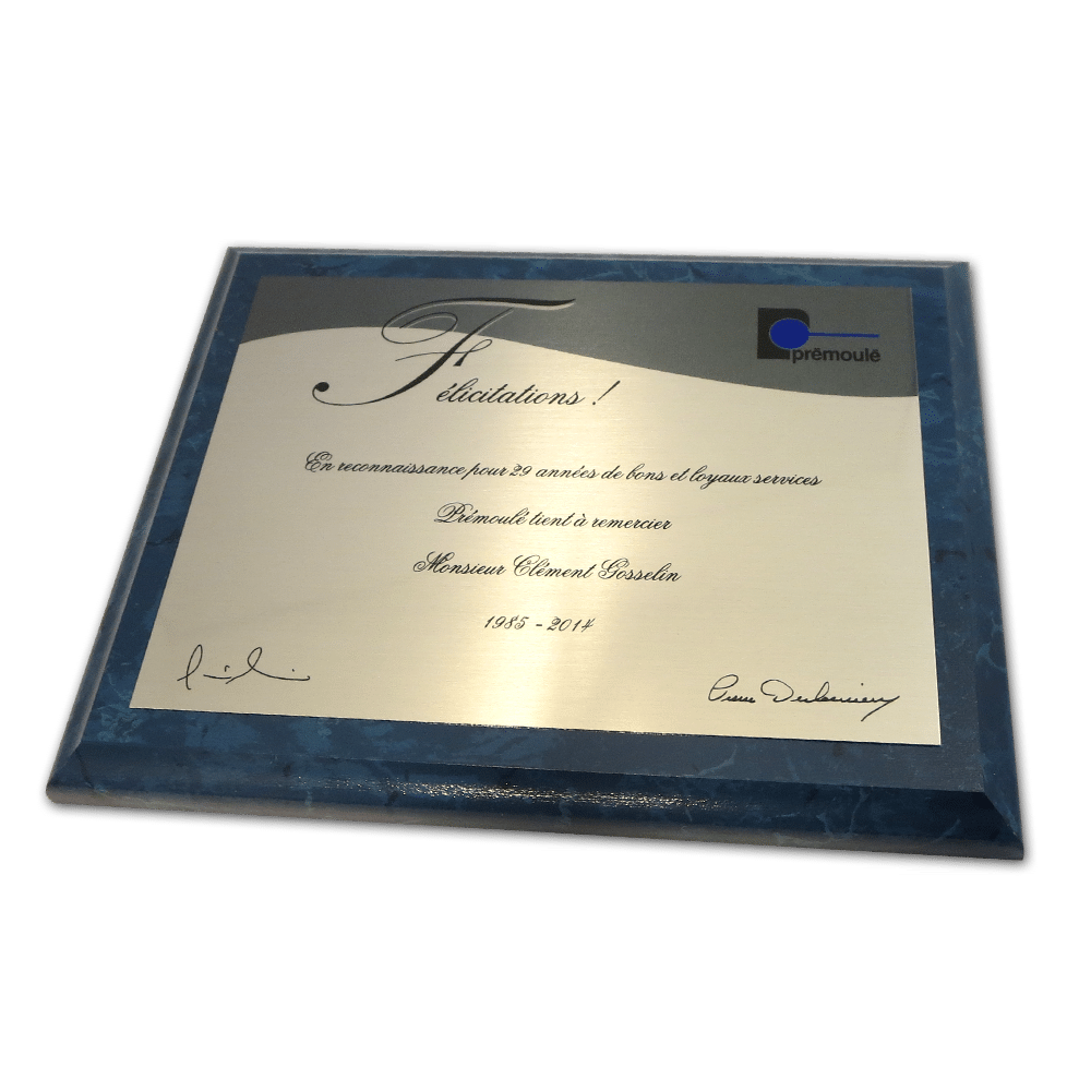Cette plaque de reconnaissance est remise lors de la retraite d’un employé de l’entreprise Prémoulé.
